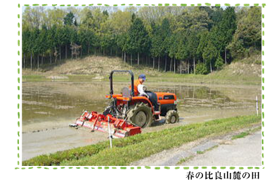 もち米づくりには比良山の清流の水をつかい、できるだけ農薬をつかわずに、籾殻(もみがら)や米ぬか、おかきのはねたものを肥料にして、良質の土づくりを心がけています。